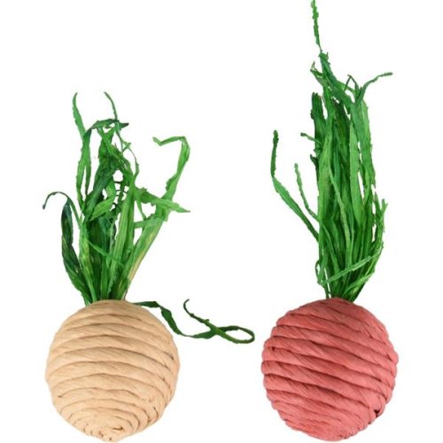 Hračka z prírodných materiálov na zabavenie v klietke a podporu hlodania a obrusovania hlodavých zubov. Guličky spletené z prírodných vlákien napodobňujúce reďkovky, s kukuričným šuštím miesto vňatia. Rozmery: priemer 4,5 cm Balenie obsahuje 2 ks.