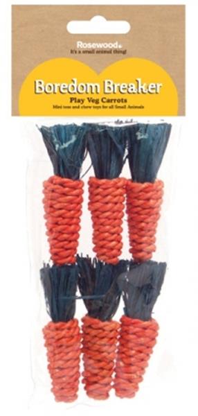 Šesť mrkvičiek vyrobený z prírodných materiálov, ktoré zabavia králiky, morčatá, osmáky, škrečky a ďalšie hlodavce. Podnieti aktivitu zvierat, hlodanie, zaženie nudu a tým prispieva k ich psychickej pohode. Mrkvičky spletené zo sisalu a vňatia z kukuričného šuštia, zafarbené pre zvieratá bezpečnými farbami. Približné rozmery: priemer 2,5 cm, dĺžka 8 cm