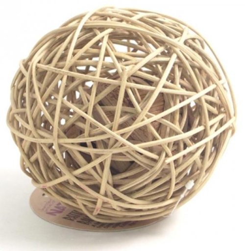 Pletená ratanová guľa, vo vnútri s guličkou z listov vodného hyacintu. Hračka pre drobné cicavce, ktorá zaháňa nudu a podporuje hlodanie, vyrobená zo 100% prírodných materiálov bez použitia lepidiel, drôtov a svoriek. Priemer gule 15cm.