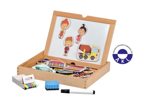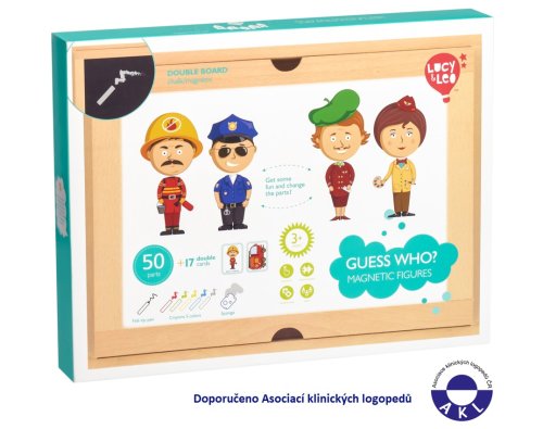 Deti vyberajú správne kombinácie magnetických častí a priraďujú ich k predlohám, hádajú povolanie a vytvárajú vlastné príbehy. Vďaka kartám a obojstrannej tabuli precvičia farby, tvary aj vyjadrovanie a naučia sa spolupracovať. Po hre všetko ľahko uloží do dreveného kufríka, ktorý ľahko zbalí so sebou na cesty.