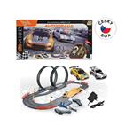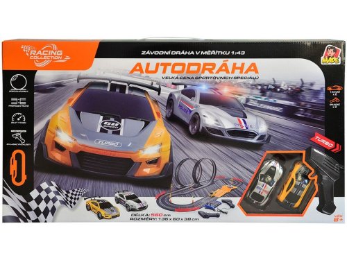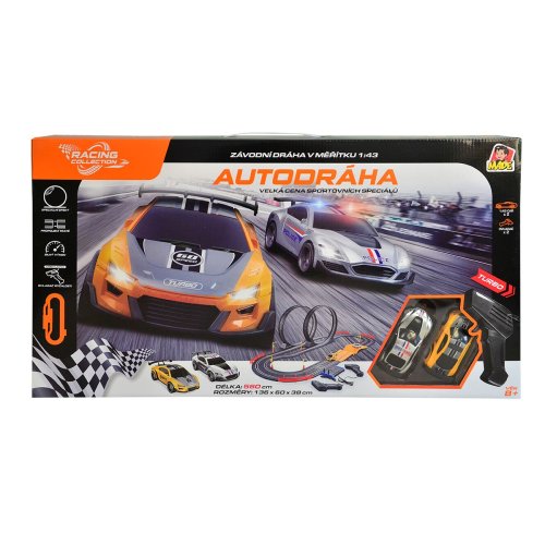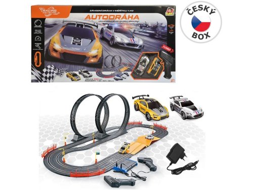 Sada obsahuje 2 rýchle závodné autá , 2 citlivé ovládače s adaptérom a navyše sa autodráha môže pochváliť aj elektronickým počítadlom bicyklov , ktoré zaznamená každý prejazd, takže si bude vaše dieťatko pripadať ako skutočný pretekár na okruhu. Napájanie obstará osmero 1,5 V AA batérií , ktoré nie sú súčasťou balenia. Autodráha potom pracuje na osvedčenom analógovom systéme , čo znamená, že rýchlosť autíčok je daná napätím v koľajniciach , ktoré sa menia stlačením ovládačov. Toto riešenie je jednoduché, bezpečné a úplne spoľahlivé.