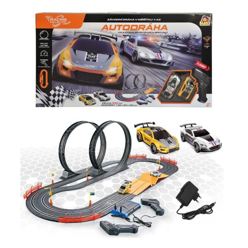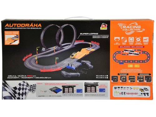 Pre neskutočne vzrušujúcu jazdu ocení vaša ratolesť nebezpečný „looping“ oblúk , super skákací mostík s vhodnými doplnkami, jasne oranžové zvodidlá a možnosť prekríženia či zúženia trate , takže sa ako mávnutím prútika premení na skúseného pretekára, kaskadéra alebo návrhárskych závodných. Kríženie na trati zaistí vyrovnané preteky, pretože jednu zákrutu pôjde autíčko vnútornú stopu a druhú zákrutu vonkajšiu. Navyše vďaka nehodám a kolíziám pri krížení trasy preteky získajú na väčšej atraktivite, vďaka čomu sa bude baviť celá rodina.