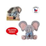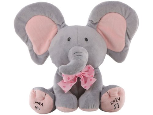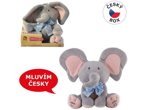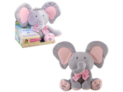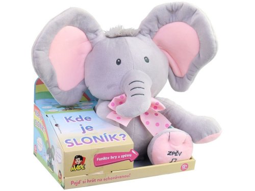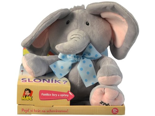 Kto sa to schováva? Kuk! To som ja, tvoj priateľ Sloník! Viem hovoriť, viem spievať a rád sa hrám na schovávačku. Stlač moju ľavú labku a vypočuj si veselú pesničku alebo stlač moju pravú labku a zahraj si so mnou na schová vanou. Sloník spieva peknú pesničku a hovorí po česky . Hrá sa s dieťaťom na schovávačku. "Nájdi ma!" "Tu som!"