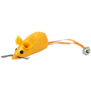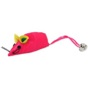 Myš z lesklej neónovej látky s rolničkou.
