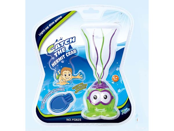 Hračka na potápanie, krab pustovník. Vydáva svetelné efekty. Rozmery hračky 18x8x22 cm. Batéria 3xAG3, súčasťou balenia. 3 varianty - zelená, oranžová, ružová.