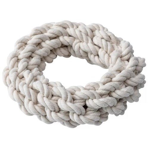 Bavlnené preťahovadlo pre psov v tvare kruhu je spletené z pevných prírodných povrázkov. Hodí sa na preťahovanie, aportovanie aj hryzenie. Počas hry prirodzene čistí chrup a prispieva k zdraviu zubov a ďasien. Rozmery (cca): Ø 15 cm Veľkosť: M Materiál: bavlna Farba: biela Upozornenie: Hračka nie je určená deťom. Na použitie iba pod dohľadom. Hračku pravidelne kontrolujte av prípade poškodenia prestaňte používať.