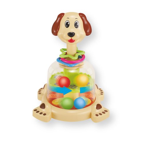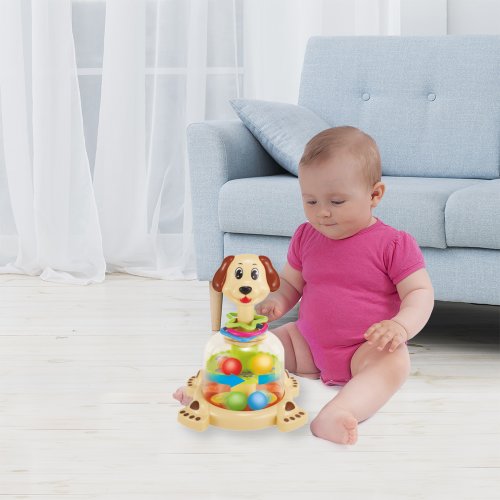 Pestrofarebný mechanický kolotoč v tvare psa je naplnený farebnými guličkami, ktoré budú po stlačení hlavy rotovať, skákať a vydávať hrkajúci zvuk. Táto hračka zaujme a pobaví aj tie najmenšie deti. Farby sa môžu líšiť od vyobrazenia.