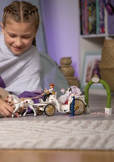 Emily vyzerá vo svadobných šatách rozkošne. Ženích Toby sa tiež vyparádil. Spoločne nasadajú do svadobného kočiara, ku ktorému je pripevnený rad prázdnych hrkajúcich plechoviek. Hanna vyzdobila lipicána aj kočiar, aby všetko vyzeralo slávnostne. Kôň má na sebe návleky so srdiečkami a uzda je tiež zdobená srdiečkami. Svadobčania si v kočiari urobia pohodlie na vankúšoch v tvare srdca a pripijú si šampanským. Čo je to? Pod sedadlom je tajná schránka! Sú tam schované jablká na neskôr, aby lipicán mohol dostať odmenu za svoju tvrdú prácu. Obsah: 1x lipicán, 1x nevesta Emily, 1x ženích Toby, 1x Hannah, 1x kočiar, 5x plechovka, 1 povrázok, 1x truhla, 1x fľaša, 1x fotoaparát, 1x uzda, 1x opasok, 1x šaty, 1x šaty, 1x šaty vesta dekorácia, 2x gamaše, 1x jablká, 1x kytica, 2x ker krušpán, 1x oblúk z buxusu, 1x znak, 2x holubica, 1x vankúšik, 1x koberec. Rozmery balenia: 23 x 28 x 11cm. Vek: 5+