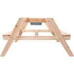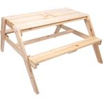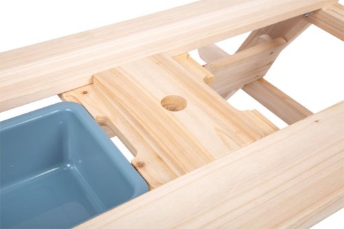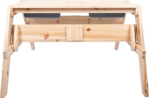Baví Vás vyrábať bahno a iné zmesi z prírodných materiálov? Tento stôl z masívneho dreva odolného voči poveternostným vplyvom upúta nielen pozornosť na záhrade, terase alebo balkóne, ale predovšetkým ponúka deťom možnosť dlhej hodiny kreatívnej hry na čerstvom vzduchu. Vrchol sa skrýva vo vnútri detského stolíka. Akonáhle sa zdvihnú dve stolové dosky, vznikne úžasné miesto na hranie s pieskom, vodou alebo blatom. Dve odnímateľné vaničky z robustného plastu s objemom 3 litre každá, sú ideálne nielen na miešanie rôznych materiálov, ale aj na uskladnenie hračiek na piesok, uskladnenie piesku, zber prírodných materiálov alebo naplnenie vodou. Lavice sa dajú sklopiť. Šikovná , multifunkčná detská sedacia súprava, ktorá okrem funkcie posedenia môže slúžiť aj ako piknikový stôl, stôl na maľovanie atď. Priehlbiny v oblasti plastových vaní uľahčujú vyberanie vaní a do otvoru uprostred plochy stola sa dá zasunúť slnečník na tienenie. Rozšírené nohy zaisťujú bezpečné postavenie, stabilitu a vysoko kvalitné drevo zaručuje dlhú životnosť. To je dôležité, pretože stôl povzbudzuje deti, aby prichádzali s novými, kreatívnymi nápadmi na hranie a experimentovali po dlhú dobu. Čo pláva na hladine vody, čo sa potápa? Čo sa stane s pieskom keď zmokne? Aké tvary môžete vytvoriť s hračkami do piesku? Hra s pieskom ponúka množstvo zmyslových podnetov prostredníctvom povrchového vnímania kože a podporuje jemnú motoriku. Na dlhodobé používanie a na ochranu neošetrovaného dreva je možné ho ošetriť ochrannou lazúrou na drevo a farebne upraviť podľa vlastných potrieb . Hlavné vlastnosti: multifunkčné posedenie 2 v 1 vyrobené z masívneho dreva2 vyberateľné multifunkčné plastové vaničky (3l)kompaktné posedenie na terasy, balkóny a záhradynosnosť 100 kg