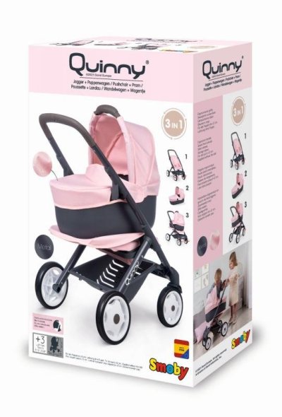 Všestranný kočík pre bábiky 3 v 1 značky Smoby . Moderný multifunkčný kočík pre bábiky môžete vďaka vymeniteľnej korbičke behom chvíľky prestavať na praktický športový kočík pre bábiky. Vrchnú časť môžete v niekoľkých jednoduchých krokoch zložiť a bábiku so sebou vziať kamkoľvek pôjdete v praktickom košíku. Poťahy kočíka sú vyrobené z robustnej plastovej tkaniny. Na čistenie ho môžete ľahko utrieť vlhkou handričkou. Kočík je vhodný pre bábiky do veľkosti 42 cm . Bábika nie je súčasťou balenia. Výška k ergonomickej rukoväti je 65 cm. Predné kolieska sú otočné a majú protihlukovú vrstvu.