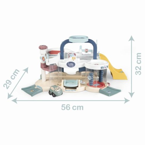 Multigaráž Little Smoby má veľký otočný nákladný výťah, parkovisko a veľké rampy na splavovanie. Skoková rampa poskytuje potrebnú hybnosť pre rýchlejšiu jazdu. Pohyblivé zábrany ukazujú, kde je prejazd zakázaný, pretože rampa môže byť inštalovaná na dvoch rôznych miestach. Nad parkovacou plochou je helipad , kde štartuje a pristáva vrtuľník. V spodnej časti multigaráže s dielňou a umývačkou je o autíčka dobre postarané. Široké nájazdové rampy a zábrany zaisťujú regulovaný proces. Súprava obsahuje jedno mini autíčko.