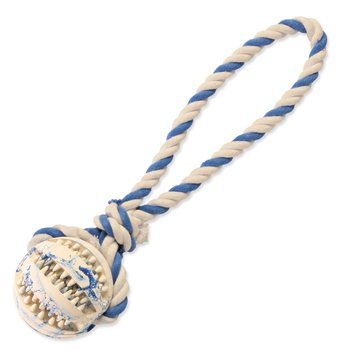 Hračka preťahovadlo pre psov. Špeciálne drážky na loptičke masírujú ďasná a zároveň zabraňujú tvorbe zubného povlaku.