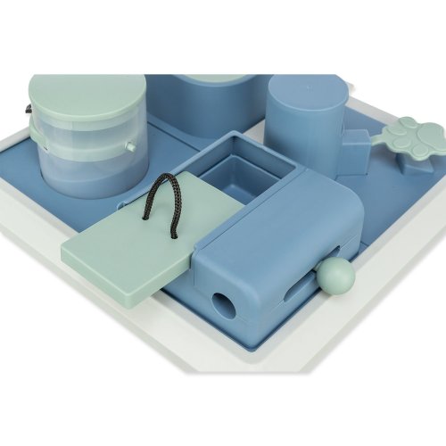 Schovajte granule alebo maškrtu do hračky a nechajte psa si užiť zábavu s hľadaním. Pes môže použiť labu alebo ňufák na posúvanie plastových štvorcov, ich otvorenie alebo nadvihnutie častí hračky a získať tak maškrtu.