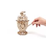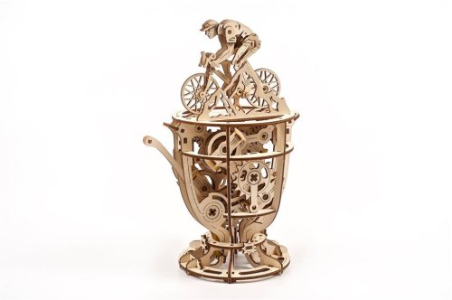 Po zoskladaní získate cyklistu na bicykli umiestneného na hornej strane pohára. Rozpohybujete ho pomocou páky . Doprajte si pohľad na prepracovaný mechanizmus a upravujte dĺžku jazdy pomocou mincí a žetónov. Tie vložíte do ramien zotrvačníka a pozorujete zmenu správania vášho cyklistu . Naučte svoje deti, ako zotrvačník funguje, alebo obdarujte touto skladačkou nadšencov do cyklistiky.