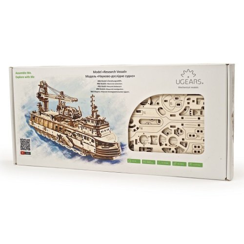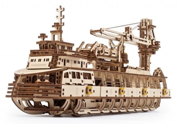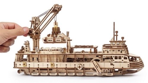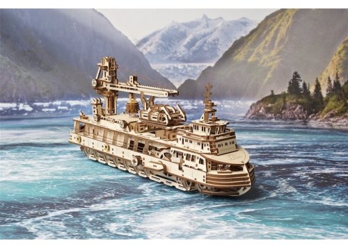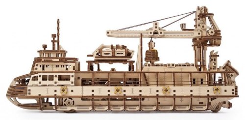 Stavebnica oceánografickej lode vyrobená z preglejky od značky Ugears . Jej zostavenie je výzvou aj pre skúsenejších staviteľov, za to sa vám bohato odmení záplavou funkčných detailov a ľahko sa stane ozdobou vitríny. Loď je vybavená naťahovacím pohonom vybaveným spúšťou , jeho mechanizmus je čiastočne odhalený a môžete ho za chodu pozorovať. Smer jazdy je možné manuálne ovládať, alebo nechať loď prevodom samu atraktívne kľučkovať. Kolieska sú pre istý kontakt s povrchom dráhy vybavené gumovými krúžkami. Na palube lode nájdete prepracovaný funkčný žeriav , pomocou ktorého môžete manipulovať s detailným modelom batyskafu vybaveným funkčnými čeľusťami. Ponorku môžete umiestniť na posuvnú plošinu na palube, alebo do bezpečia aj inak využiteľného nákladového priestoru v podpalubí. Plavidlo je tiež doplnené podrobnosťami v podobe záchranného člna a miniponorky . Vybavené detailným návodom na zostavenie.