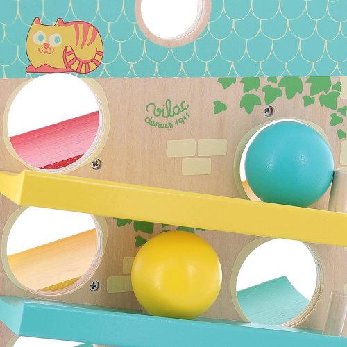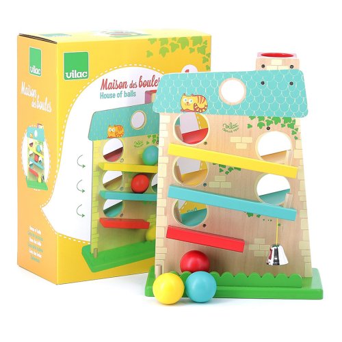 Farebný kaskádový domček značky Vilac je krásna drevená hračka, s ktorou si deti užijú mnoho zábavy. Domček má 3 rampy na oboch stranách a tak sa drevené loptičky pohybujú zhora nadol, zo strany na stranu. A keď loptička dôjde do cieľa, zazvoní kovový zvonček . Pútavá hračka podporujúca logické myslenie.