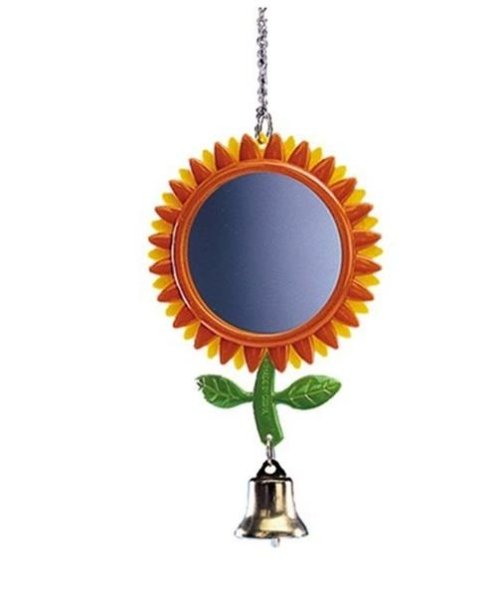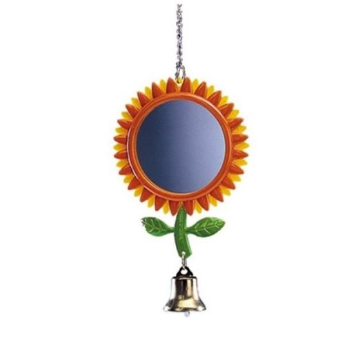 Závesná plastová hračka pre papagáje - zrkadlo so zvončekom v tvare kvety. Hračka je vhodná pre menšie typy papagájov, napr. andulky, kanáriky, atď. Jednoduché zavesenie do klietky či voliéry. Rozmery: 24 cm (výška zavesenej hračky).