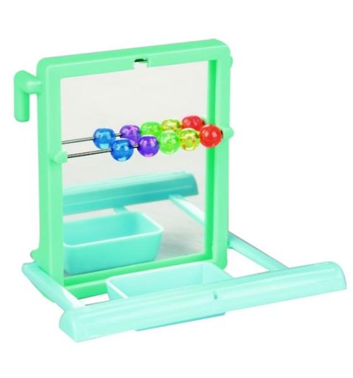Závesná plastová hračka pre papagáje - zrkadlo s bidielkom. Hračka je vhodná pre menšie typy papagájov, napr. andulky, kanáriky, atď. Jednoduché zavesenie do klietky či voliéry. Rozmery: 10 x 7 x 9 cm