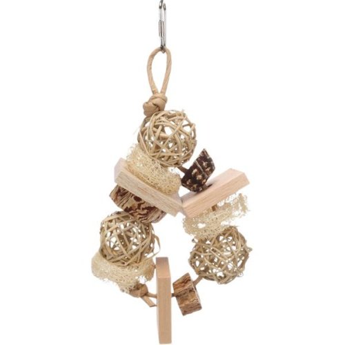 Prírodná závesná hračka z lufy, borovicového dreva, mahagónového struku a ratanu je vhodná pre rôzne druhy papagájov. Podporuje mentálnu aktivitu a prirodzenú starostlivosť o zobák. Vďaka kovovému závesnému systému sa dá ľahko zavesiť do klietky alebo voliéry. Súčasťou hračky sú loptičky, lufa, mahagónový struk a špagát, ktoré nabádajú k ozobávaniu. Použité materiály sú prírodné a bezpečné pre papagáje. Rozmery (cca): 11 × 4,5 × 25 cm Materiál: lufa, borovicové drevo, mahagónový struk, ratan a kov
