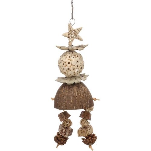Prírodná závesná hračka z kokosu, borovicových šišiek, ratanu, palmových listov, mahagónového struku a dreva sola je vhodná pre rôzne druhy papagájov. Podporuje mentálnu aktivitu a prirodzenú starostlivosť o zobák. Vďaka kovovému závesnému systému sa dá ľahko zavesiť do klietky alebo voliéry. Súčasťou hračky sú šišky, loptička, kokos, mahagónový struk, hviezdičky a povrázky, ktoré nabádajú k ozobávaniu. Použité materiály sú prírodné a bezpečné pre papagáje. Rozmery (cca): 10 × 10,5 × 32 cm Materiál: kokos, šišky, ratan, palmové listy, mahagónový struk, drevo sola a kov