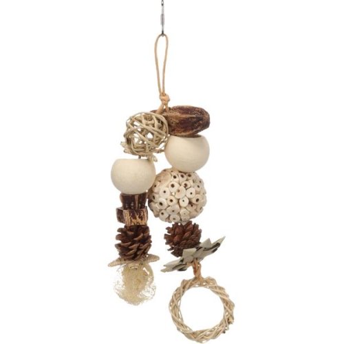 Prírodná závesná hračka z mahagónového struku, ratanu, šišiek, dreva sola, borovicového dreva, lufy a palmových listov je vhodná pre rôzne druhy papagájov. Podporuje mentálnu aktivitu a prirodzenú starostlivosť o zobák. Vďaka kovovému závesnému systému je možné ju ľahko upevniť do klietky alebo voliéry. Súčasťou hračky sú korálky, loptička, šišky, mahagónový struk, hviezdičky, krúžok a lufa, ktoré nabádajú k ozobávaniu. Použité materiály sú prírodné a bezpečné pre papagáje. Rozmery (cca): 12 × 5,5 × 32 cm Materiál: mahagónový struk, ratan, šišky, drevo sola, borovicové drevo, lufa, palmové listy a kov