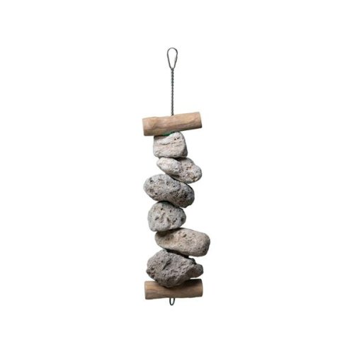 Závesná hračka pre stredné a veľké papagáje je vyrobená z lávového kameňa a dreva kávovníka. Podporuje prirodzené obrusovanie zobáka a aktívnu hru. Odolné materiály zaisťujú dlhú životnosť aj pri intenzívnom používaní. Vďaka nerezovej retiazke s kovovou karabínkou ju možno ľahko zavesiť do klietky alebo voliéry. Vyrobená z bezpečných a netoxických prírodných materiálov. Rozmery (cca): 50 × 11 cm Materiál: kávové drevo, pemza, lávový kameň, kov