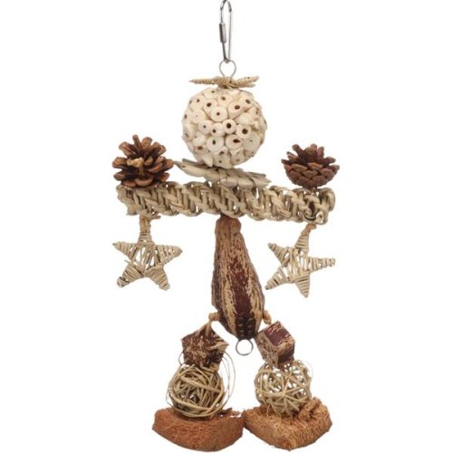 Prírodná závesná hračka z ratanu, mahagónového struku, kokosu, šišiek, dreva sola a palmových listov je vhodná pre rôzne druhy papagájov. Podporuje mentálnu aktivitu a prirodzenú starostlivosť o zobák. Vďaka kovovému závesnému systému je možné ju ľahko upevniť do klietky alebo voliéry. Súčasťou hračky sú loptičky, hviezdičky, mahagónový struk, špirála, kokos a šišky, ktoré nabádajú k ozobávaniu. Použité materiály sú prírodné a bezpečné pre papagáje. Rozmery (cca): 20 × 5,5 × 33 cm Materiál: ratan, mahagónový struk, kokos, šišky, drevo sola, palmové listy a kov