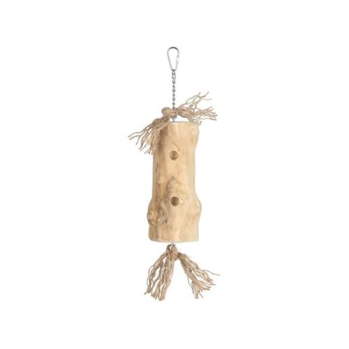 Závesná plniteľná hračka z extra pevného dreva kávovníka je vhodná pre rôzne druhy papagájov. Do otvorov v dreve je možné ukryť maškrty a podporiť tak prirodzené hľadanie potravy, skúmanie a ozobávanie. Hračka tak stimuluje psychickú aj fyzickú aktivitu. Vďaka nerezovej retiazke s kovovou karabínkou ju možno ľahko zavesiť do klietky alebo voliéry. Vyrobená z prírodných a bezpečných materiálov. Rozmery (cca): 30 × 8 cm Materiál: drevo kávovníka, juta, kov