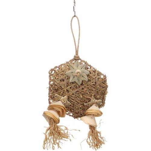 Prírodná závesná hračka z bambusu, borovicového dreva, rafie, palmových listov a ratanu je vhodná pre rôzne druhy papagájov. Podporuje mentálnu aktivitu a prirodzenú starostlivosť o zobák. Vďaka kovovému závesnému systému je možné ju ľahko upevniť do klietky alebo voliéry. Súčasťou hračky sú korálky, povrázky, strapce, hviezdičky a papierová výplň, ktoré nabádajú k ozobávaniu. Použité materiály sú prírodné a bezpečné pre papagáje. Rozmery (cca): 13 × 5,5 × 32 cm Materiál: bambus, borovicové drevo, rafia, palmové listy, ratan a kov