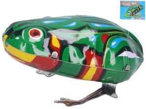 Pohyb plechovej žabky zaisťuje pérový strojček naťahovaný klíčkom. Rozmery balenia 7 x 5 x 4 cm. Vhodné pre deti od 3 rokov.