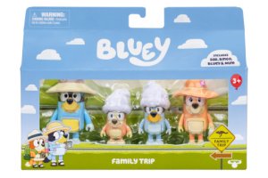 Súprava štyroch plastových figúrok rodiny Bluey pripravených na spoločný výlet.