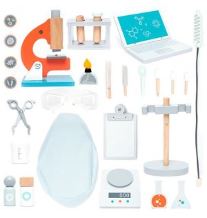 Drevené vedecké laboratórium pre deti obsahuje 29 kusov laboratórneho vybavenia - mikroskop, banky, notebook atď.