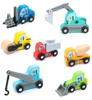 Súprava drevených stavebných vozidiel pre deti kompatibilná so sadami železníc Brio World a ďalšími značkami.