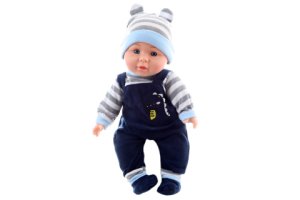 Bábätko s mäkkým telíčkom. Po stlačení telíčka začne bábätko vydávať zvuky (smiech, plač, mama, tata).