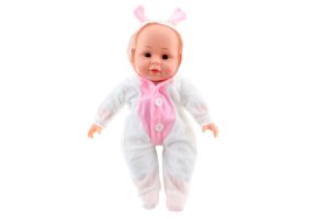 Bábätko s mäkkým telíčkom. Po stlačení telíčka začne bábätko vydávať zvuky (smiech, plač, mama, tata).