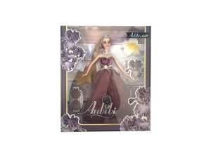 Bábika vysoká približne 30 cm je navrhnutá ako elegantná módna figúrka, ktorá upúta pozornosť svojimi luxusnými plesovými šatami v odtieni tmavej purpurovej s jemným leskom.