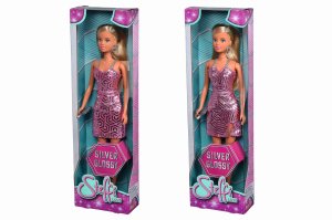 Bábika Steffi v efektných trblietavých šatách s náušnicami a sponou, 2 druhy.
