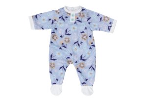 Rozkošný overal v modrej farbe s jemným kvetinovým vzorom pre roztomilý a útulný vzhľad.