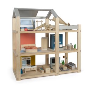 Rozmery domčeka: 67x30x67 cm Rozmery postele: 8x14x6 cm Rozmery šmykľavky: 16x5,5x8,2 cm Vek: 3+ Materiál: drevo, látka, kov, plast, plsť Pre bábiky 12 cm