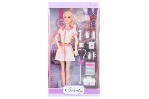 Bábika doktorka. Balenie obsahuje bábiku o veľkosti cca 29 cm s kĺbovými rukami a zdravotnícke doplnky (stetoskop, injekciu, kufrík, fľaštičky a ďalšie doplnky).