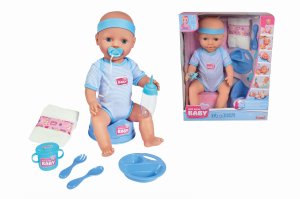 Bábätko s doplnkami. Bábätko po vložení batérií vydáva zvuky a ciká.