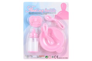 Sada doplnkov pre bábiku obsahuje fľaštičku, cumlík, tanierik a príbor.