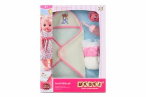 Doplnky pre bábiku 30 cm. Balenie obsahuje látkovú zavinovačku, plastový cumlík, plastovú fľaštičku a plienku.