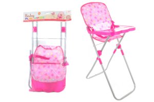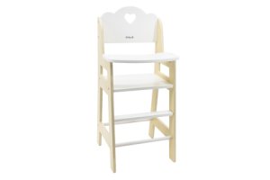 Vysoká stolička so stolíkom, v ktorej si môžu dievčatká svoju bábiku nakŕmiť. Veľkosť: 33 x 26 x 60 cm. Vhodná od 3 rokov.