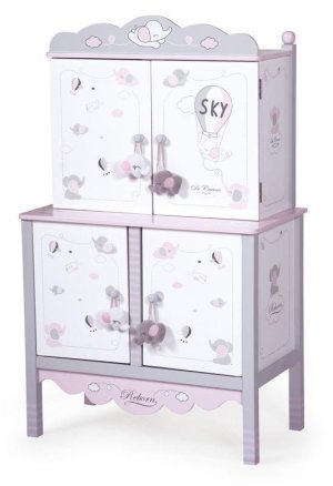 DeCuevas 54835 Drevená šatníková skriňa pre bábiky s hracím centrom a doplnkami SKY 2020 je z inovovanej kolekcie SKY 2020, ktorá má tento rok vo svojom znaku roztomilej sloníča.