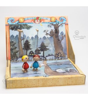 Rozmery: 32x41x46 cm Veľkosť bábok: 12-15 cm Vek: 5+ Materiál: drevo, kartón, látka Obsahuje 14 bábok a kulisy