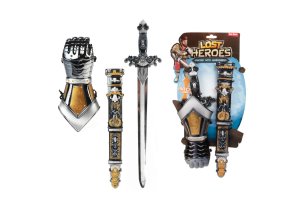 Plastový meč o veľkosti cca 49 cm a štít s rozmermi cca 26 x 19 cm.
