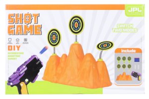 Plastová pištoľ s penovými nábojmi a papierovým terčom na ktorý môžete strieľať.
