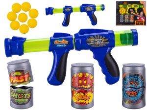 Sada obahuje zbraň, 12 loptičiek a 3 plechovky ako terče.