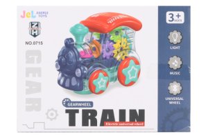 Plastová mašinka na batérie. Priehľadná mašinka plná ozubených koliesok svieti a vydáva zvuky.